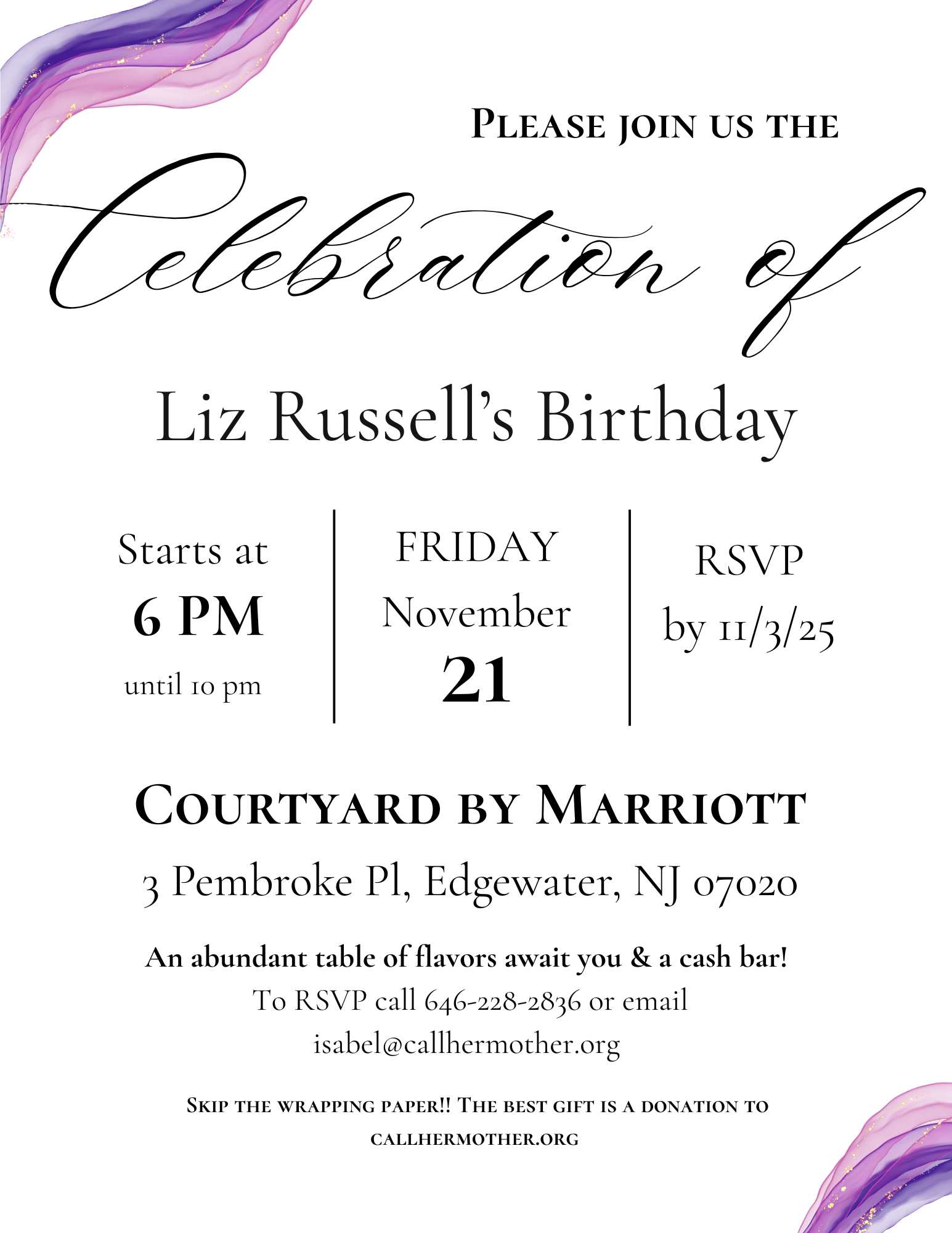 November 21, 2025 @ 6:00 pm - 10:00 pm CALL HER MOTHER FUNDRAISER Courtyard by Marriott 3 Pembroke Pl, Edgewater
